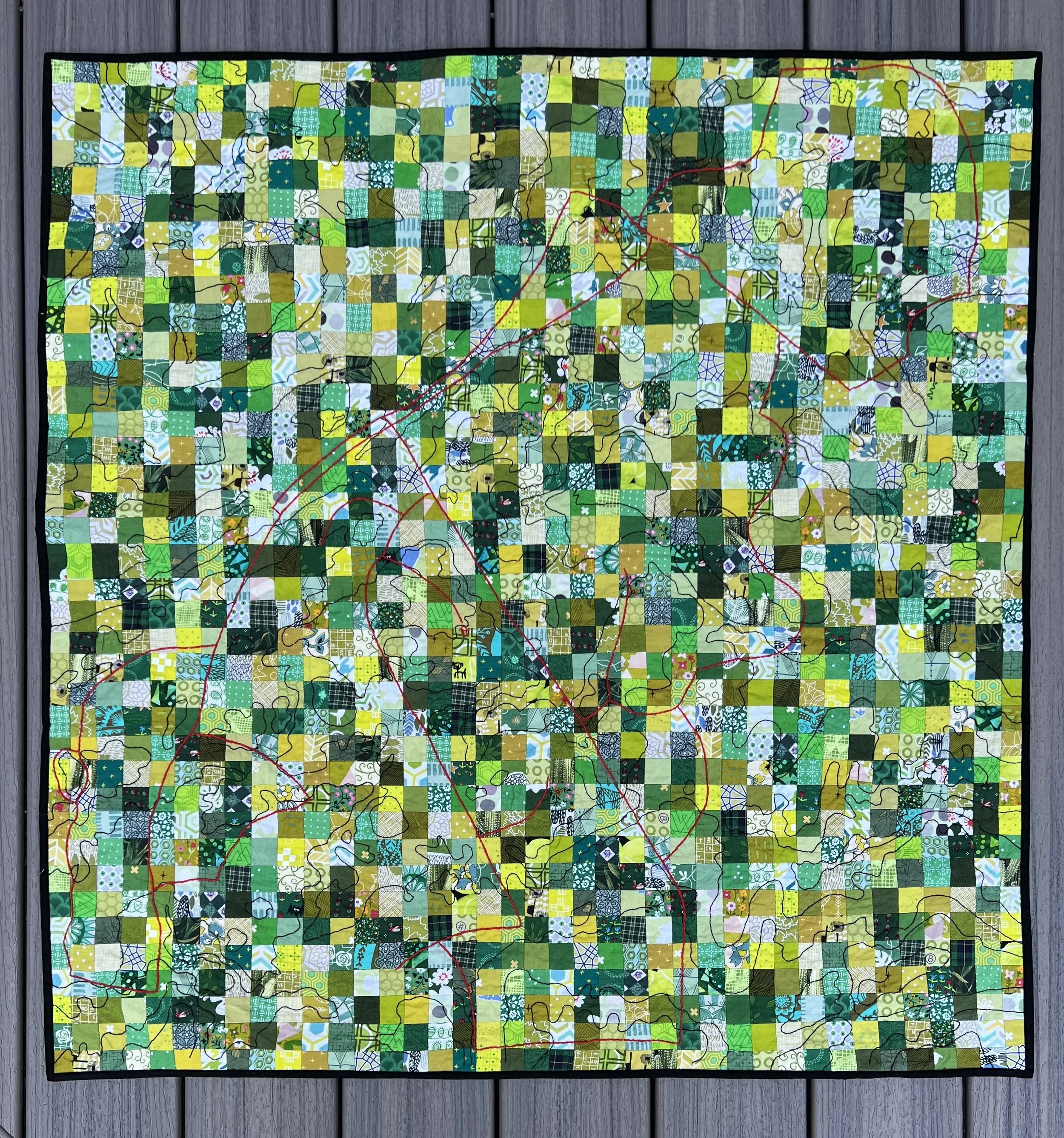 The top was pieced during a daily practice class with Heidi Parkes. I used to daily prompts to reflect on the place that has been home and workplace for me for most of my nine years in Virginia (Janelia). The result is a mental map rather than a topological one. It depicts paths I take during a typical day, my glasses that rest on my nightstand each night, the swipe care I need to get into the lab, my desk and bits of fabric that I dyed with turmeric and flowers growing on the campus grounds. With my quilting, I wanted to make a reference to a more typical map, imitating contour lines and grids. As I'm preparing to move back to Europe, making this quilt has been a great opportunity to reflect on a home away from home and what it has offered me.